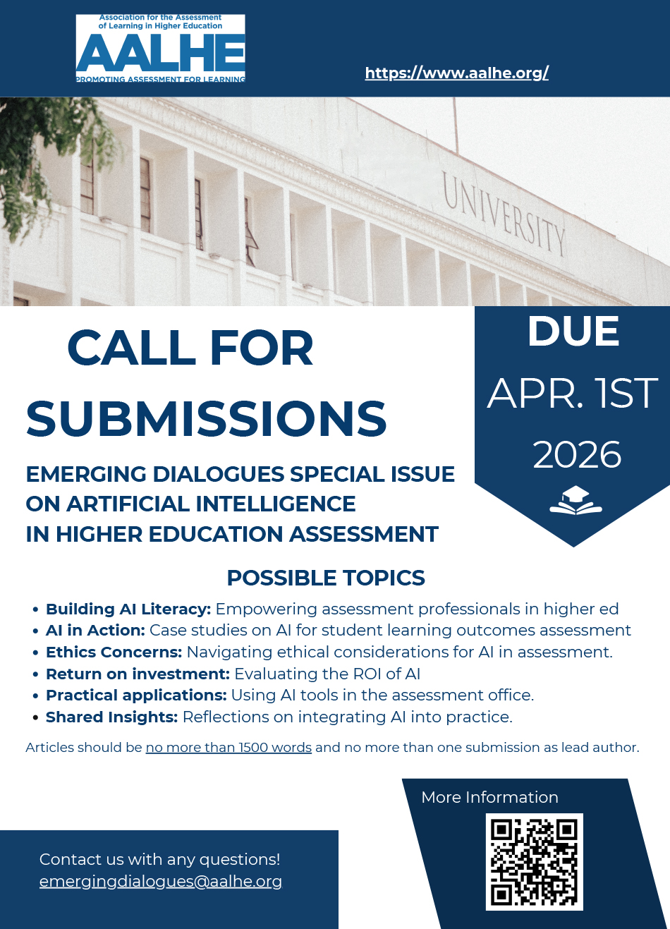Emerging DialoguesThe mission of Emerging Dialogues (ED) is to discuss current issues and ideas relevant to higher education assessment practitioners today. ED is a platform for articles focused on student learning assessment that are relevant and thought-provoking while also being well-reasoned and supported by diverse experience or research. The publication provides opportunities for professional growth in the field through authorship and participation in the peer review process. We seek new and experienced authors, professionals, graduate students, and others to write about current emerging themes (dialogues, if you will) in assessment. The peer review process is supportive and iterative, especially for first-time submissions. We encourage people to submit both formal and informal articles, including: