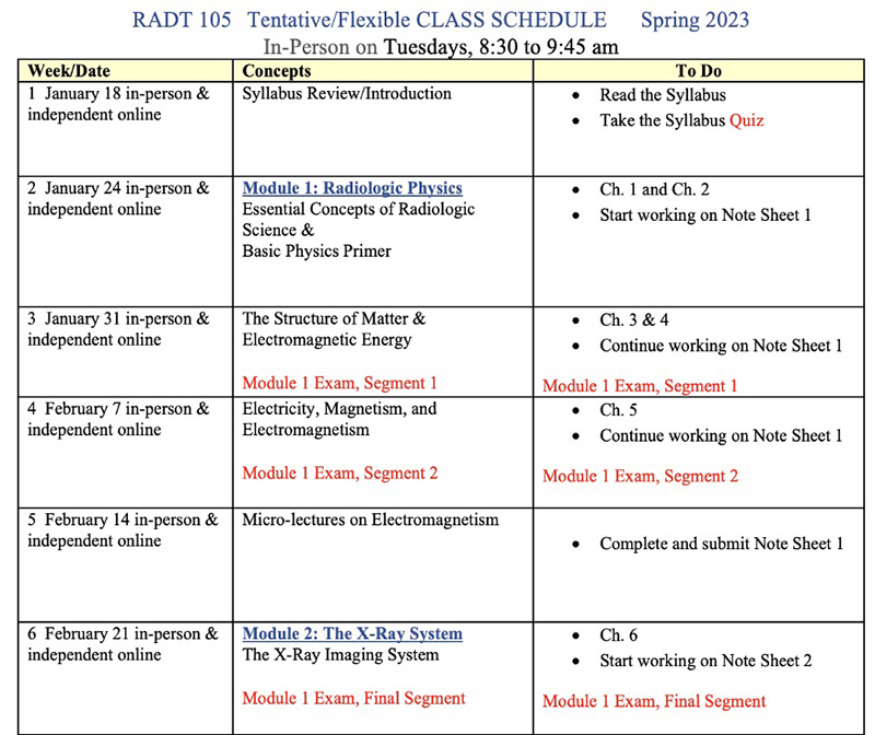 As students move through the NSAs, aligned module exam segments are given during the in-person sessions of the hybrid class (please see a syllabus schedule outline in Figure 3). Figure 3: Syllabus schedule excerpt demonstrating the spacing of module exam segments.