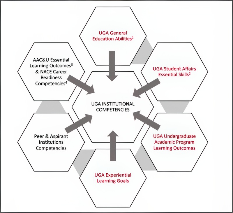 PrologueFor those who enjoy reading fiction - do you ever flip to the last chapter and spoil the ending of a page-turner? I admit, I do. So, I’m going to jump ahead – spoiler alert! – and reveal our six institutional competences: (1) Critical Thinking, (2) Analytical Thinking, (3) Communication, (4) Social Awareness and Responsibility, (5) Creativity and Innovation, and (6) Leadership and Collaboration. Now, back to the beginning – how did these come to be? This essay will chronicle the University of Georgia (UGA)’s journey to identifying, developing, and implementing these institution-level competencies as shared learning goals for all undergraduate students. In 2017, the University president convened a task force on student learning and success, which recommended reorienting the general education curriculum to better reflect students’ broader educational and life goals. The proposed vision emphasized interdisciplinary exploration and lifelong learning. This recommendation aligned with national trends: a NILOA (2017) survey found that most institutions had institution-wide learning statements, with many aligning program-level outcomes accordingly. [Institution] leadership supported the rationale for institution-wide undergraduate learning outcomes to shift from a fragmented academic experience to a more integrated one, linking curricular and co-curricular learning (Jankowski & Marshall, 2017). While the initial focus was on general education, the task force’s broader vision laid the groundwork for a university-wide conversation about institutional competencies. Part I: Experiential LearningFast forward to 2020. The Director of Experiential Learning (EL) at the University initiated conversations with key stakeholders about officially documenting the learning that was happening in EL. In doing so, he developed a ‘competencies taxonomy’ based on the learning outcomes associated with EL, cross-referenced with core competencies identified by the National Association of Colleges and Employers (NACE) and other college-career readiness-centered organizations. This taxonomy, as well as our institution’s existing General Education Abilities (broad cognitive skills we intended students to acquire via completion of the general education curriculum) and Student Affairs Essential Skills (cross-disciplinary skills we intended students to develop and strengthen via co-curricular learning experiences), were the first iterations of our institutional competencies. The General Education Abilities were: Written Communication, Oral Communication, Critical Thinking, Moral Reasoning, and Quantitative Reasoning. The Student Affairs Essential Skills were: Agility, Critical Thinking, Communication, Leadership & Collaboration, and Social Awareness & Responsibility (note there was already overlap!). To further develop and implement the concept, the EL director strategically convened a working group including the Office of Instruction, Assessment, Registrar’s Office, and Division of Student Affairs. It did not take long to recognize that this taxonomy captured more than just EL, and we could expand the concept to combine shared learning goals for the institution through curricular and co-curricular learning. Additionally, UGA’s Office of Instruction could officially document and verify these competencies through a Comprehensive Learner Record and a thorough and strategic assessment design. At this point, the project vision expanded, and the working group forged ahead with bold(er) goals. Part III: Institutional Competencies Working GroupThe working group convened regularly to develop and refine a set of institutional competencies with associated learning outcomes. This iterative process began with a review of existing established undergraduate learning goals at the university (e.g., General Education Abilities, Student Affairs Essential Skills, undergraduate program learning outcomes), supplemented and calibrated by a review of peer and aspirant institutions’ shared competencies, the Association and American Colleges and Universities’ (AAC&U) Essential Learning Outcomes, and NACE’s Career Readiness Competencies (see Figure 1). Figure 1. Sources that Informed the Development of UGA’s Institutional Competencies