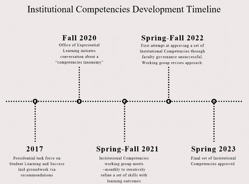 Through conversations with the General Education subcommittee of the University Curriculum Committee, the Experiential Learning Council, Division of Student Affairs representatives, Office of Assessment, Office of Accreditation and Institutional Effectiveness, Career Center, Student Learning Outcomes Executive Committee, and leadership within the Office of Instruction, the group reviewed, discussed, and refined evolving drafts of the competencies. At this point, the group agreed upon certain skills to include unquestionably (e.g., critical thinking, communication) but had to extensively discuss several other important learning goals and the precise skillsets we aimed to capture (e.g., quantitative and analytical skills, ethical reasoning, leadership). Part IV: An Opportunity to ClarifyIn the spring of 2022 (see Figure 2), following an unsuccessful attempt to secure faculty governance approval for the proposed institutional competencies (by couching it as a simple General Education policy change, which led to confusion), the working group reconvened with many self-generated clarifying questions: WHY have a set of institutional competencies? Should we make the distinction that these are meant for undergraduate students? Are these the "right" competencies? How do we know? How do we reconcile and clarify the relationship to general education? When we imagine a student's Comprehensive Learner Record, what shows up? Assessment of competencies... how will we validate this learning? How many learning outcomes should be associated with each competency? Are the outcomes measurable? The working group engaged deeply with each of these questions. The responses were often interrelated. The hard-earned outcome was a set of revised competencies that we felt were well established, defendable, and universal across learning experiences and contexts. The table (Table 1) below offers our final list of competencies with our definition, along with behind-the-scenes commentary on their development. Figure 2. Institutional Competency Development Timeline