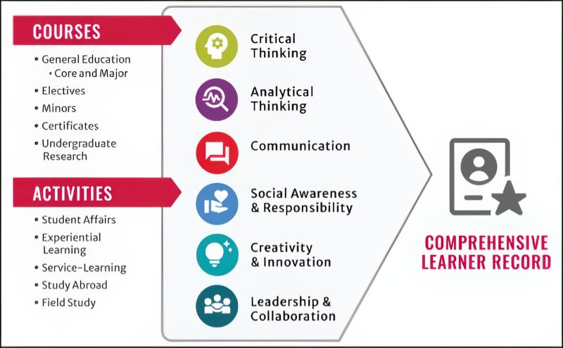 Part VI: Learning OutcomesTo support the mapping of courses and experiences, and to solidify the foundation for our forthcoming assessment plan, we then had to develop and revise the learning outcomes for each competency. To guide this conversation, we asked ourselves, what are the essential behaviors that define this competency? This process proved equally, if not more, time-intensive than finalizing the competencies themselves. Ultimately, we agreed that four learning outcomes per competency felt appropriate and reasonable for operationalizing the mapping schema and assessment plan. The group drew extensively from the language of multiple AAC&U VALUE rubrics, knowing they were likely to be part of our assessment design, to ensure alignment between outcome language and evaluation tool(s). Part VII: Faculty GovernanceIn spring 2023, we re-situated the proposal for institutional competencies as its own policy. The proposal included a clearer rationale for the institutional competencies, particularly why these were the most appropriate for [Institution]’s context. We had examples of course and co-curricular activities where students would develop and strengthen these competencies. We prepared thorough responses to questions about implementation and assessment. After more than eighteen months of conversation and revisions, the proposal successfully advanced through the University Curriculum Committee, Executive Committee, and University Council. To our surprise, these groups had few questions and only positive reception. We would like to think the concept of institutional competencies, as well as our thoughtful approach anticipating their questions ahead of time and proactively addressing them in the proposal, helped our colleagues agree the proposal was universally beneficial. ConclusionThe University of Georgia’s development of institutional competencies represents a collaborative, iterative, and evidence-informed approach to enhancing undergraduate education. By aligning curricular and co-curricular learning with clearly defined outcomes, the institution has laid a foundation for more integrated assessment, meaningful student reflection, and improved communication of learning to external stakeholders. This case study may serve as a model for other institutions seeking to articulate and assess shared learning goals at scale. Epilogue: The Comprehensive Learner RecordThe Comprehensive Learner Record (CLR) serves as a tangible extension of our institutional competencies, translating learning outcomes into demonstrable achievements. UGA’s Office of Instruction now invites campus units to submit approval requests for courses and activities that align with competencies. Note: There is no requirement for students to complete specific competencies, nor are academic units mandated to align offerings with them. The Institutional Competency Committee, a subcommittee of the University Curriculum Committee, began convening in Fall 2024 to approve such requests. Once approved, courses that map to institutional competencies will display on students’ Comprehensive Learner Record (CLR). The CLR is a digital tool that offers a holistic summary of student learning and helps students communicate the knowledge and skills gained due to their cumulative educational experience (see Figure 3). By capturing both curricular and co-curricular experiences, the CLR allows UGA to recognize, validate, and showcase for students the full scope of their learning in alignment with our competency framework. Figure 3. Visual Concept for UGA’s Comprehensive Learner Record