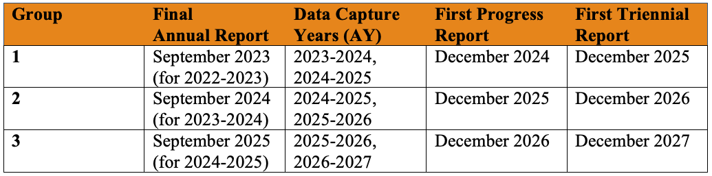 Given these challenges, the university’s Assessment Steering Committee (ASC) began exploring alternative reporting cycles in the Summer of 2023. After discussing options, the decision was made to implement a triennial reporting cycle. As the name suggests, programs submit a full, detailed report once every three years instead of every year. This does not mean, however, that they are free from reporting anything in those first two years; in lieu of a full report, programs submit brief updates (i.e., progress reports) on their assessment activities for the academic year (e.g., description of data captured, if any actions to seek student learning improvement were implemented, etc.). The key difference is that no analyses or new plans to seek improvement are required in the progress reports. Overall, this process allows programs to spend more time capturing and reflecting on data. Additionally, programs are divided into three groups (i.e., cohorts) so that in any given year, only a third of programs submit full reports. This makes the process more manageable for assessment staff. Notably, colleges were kept together, as splitting them up would have caused considerable challenges in keeping implementation timelines in order. The triennial cycle is not an entirely novel approach, as Christopher Newport University (CNU) implemented a triennial cycle in the 2014-2015 academic year (Lyons & Polychronopoulos, 2018). As such, UTK staff discussed the implementation with CNU and proceeded to plan an adaptation of that process. Iterations were passed through the Assessment Steering Committee, Academic Assessment Council, various faculty who had experience in writing and/or reviewing annual assessment reports, and a consultant affiliated with the regional accreditor before a final version was enacted. Steps within this new cycle can be found in the graphic below. RolloutTo roll out the process, a series of informational sessions were held by the ASC for each group of programs. Four in-person and two Zoom sessions were offered for each group, totaling six options for participants to choose from. Invitees consisted of report writers, department heads, and assistant/associate deans for academic affairs. Though report writers carry the responsibility of ensuring information is submitted, the ASC considered it essential that department and college-level leadership was included as well. As a result, each group consisted of 80-100 invitees. Sessions covered the rationale behind the transition from annual to triennial reporting, what the transition timeline was for their respective group, and future timelines. With three groups, the transition is staggered. The table below shows the implementation timeline for each group: Challenge of ImplementationThe main challenge in the implementation was the adjustment of reporting deadlines. This manifested itself in two ways: First, the annual cycle reports were due by September 22nd for the previous academic year. With the triennial cycle, programs spend two academic years capturing data and submit a report by the end of the fall semester of the third year (December 15th). Because the institution did not wish to have different deadlines for progress reports vs full reports, progress reports are due by December 15th as well. To avoid having programs submit their last annual report in September and a triennial progress report just 3 months later, programs submit only one progress report in their first triennial cycle. For example, the first group submitted their last annual reports in September 2023 and then submitted a progress report in December of 2024. They will submit their first triennial report in December 2025 that features analyses on data collected in AY 2023-2024 and AY 2024-2025. After that, they will be in the cycle of 2 progress reports (December 2026 and 2027) before their next triennial report (December 2028) is due. This has caused slight confusion amid implementation but has been quickly resolved by proactive reminders and frequent conversations with programs. Second, a small number of faculty initially struggled with the shift in deadlines. Primarily, they cited the end-of-semester workload of submitting final course grades and mid-year graduation activities as challenges in meeting the deadline. These concerns have been alleviated by opening the report template several months before the deadline, allowing programs to submit the report earlier if they choose to do so. Current StatusAs referenced earlier, Group 1 submitted their first progress reports in December 2024. The template was built and launched within the university’s assessment management system in Summer 2024, giving programs several months to familiarize themselves with the template. Additionally, the ASC provided examples of progress reports to guide their efforts. As the deadline approached, frequent reminders were issued, and assistance was offered from the Assessment Steering Committee via email and drop-in help sessions in finalizing reports. As a result, 92 out of 99 reports were submitted by the deadline. A further four reports were submitted within a few days after, leaving only a handful that had to be “chased down.” This is considered a satisfactory result, particularly given that the process was so new. When the template was created, an option at the end of the form asked programs if they wanted an assessment consultation. This was part of the efforts for assessment staff to become more proactive in their assessment approaches. Eleven programs selected yes to that option, and thus part of the Spring 2025 semester was spent following up with those programs. Moving ForwardIn Spring 2025, report preview sessions were offered to each group that were tailored to where they were within the new cycle. Group 1 was guided through the full triennial report template, as it featured a significant overhaul from the previous annual report template. Group 2 was shown the progress report